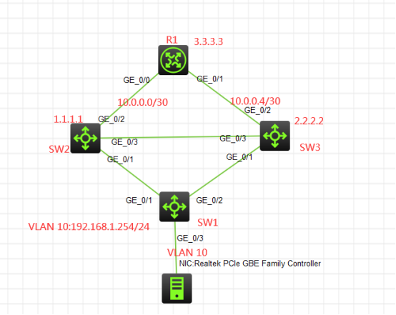 本案例采用H3C HCL模拟器来模拟IPV6 VRRP典型组网配置。为了确保网络的冗余,将SW2和SW3开启VRRP作为网关冗余。SW2为主设备,SW3为备用设备。SW2、SW3与R1的互联采用ospf路由协议互通。当断开SW2的GI1/0/2上联口是,物理机能走SW3方向去往R1。
