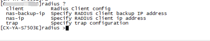 [xxxxx]radius ? client Radius Client config nas-backup-ip Specify RADIUS client backup IP address nas-ip Specify RADIUS client ip address trap Specify trap configuration 没有radius方案的命令。。