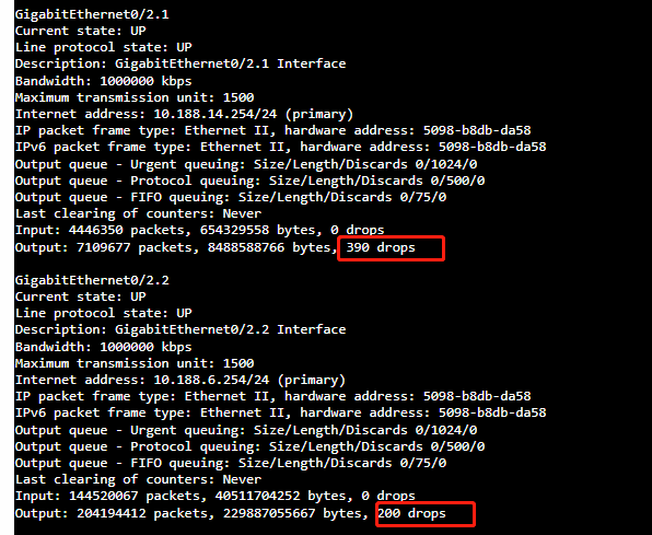 今天查看了路由器的接口,发现了这个,这个是表示有存在丢包吗?这个接口是接内网的,用了子接口做单臂,