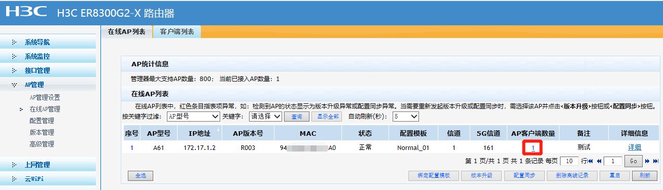 查看在线AP情况及设备连接情况: