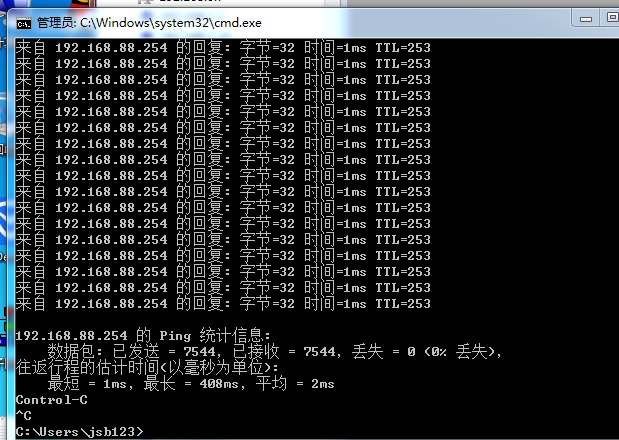 同时我进行了ping那交换机的测试,没有丢包,如下图: