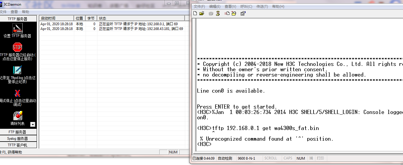<H3C> tftp 192.168.0.1 get wa2600a_fat.bin