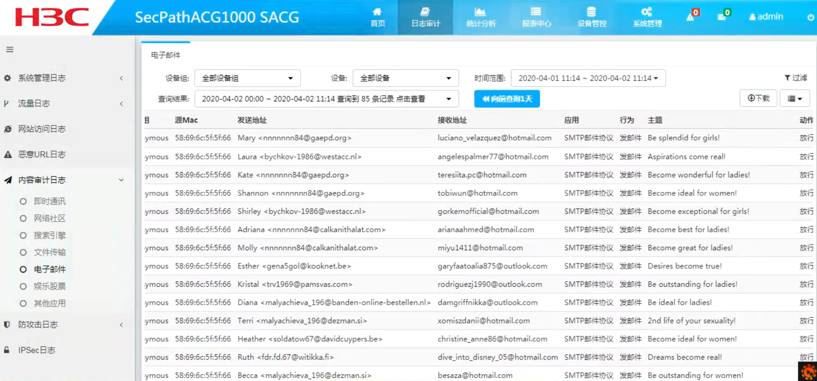 在用acg1000-PE做日志审计时发现了大量的邮件收发都是非常少见的国外的邮箱地址,现网里是没有这种邮箱收发行为的,请问这个是怎么回事?