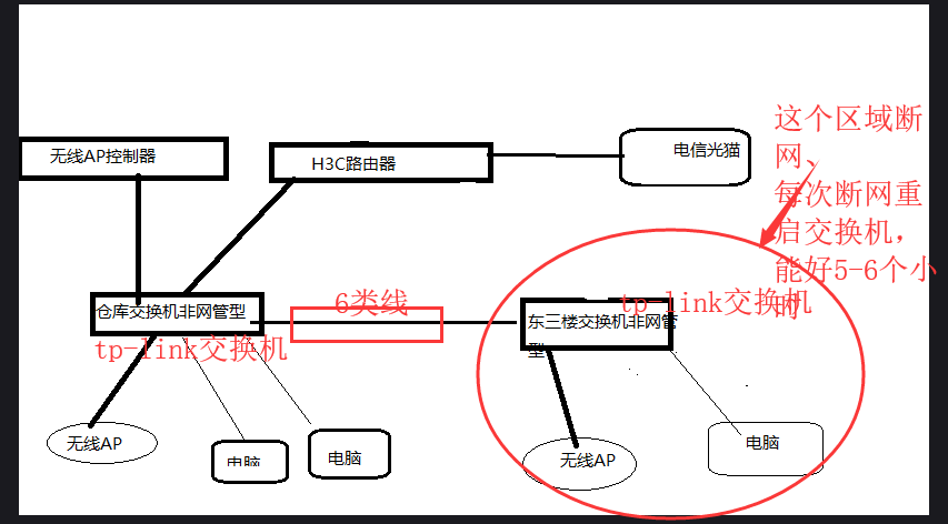 3、 排除交换机问题,东三楼交换机换过,且出现问题时仓库网络正常,但是网线两端端口死掉,接入的终端获取不到IP地址,但是交换机灯并没有异常闪烁