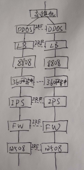 如图所示,公网-交换机-DDOS(IRF,二层透传)-LB(IRF,NAT功能)-8808(二层透传)-360网神(高可用)-IPS(IRF,二层透传)-防火墙(IRF,二层透传)-12508(IRF)。(拓扑不能改,是客户指定),除了360之外都是H3C产品,12508到LB都是二层透传,安全产品策略全放通,除了8808都做了堆叠,12508和防火墙之间是二层链路聚合,其它互联没有配链路聚合,FW,IPS都开启了会话一致性功能,负载初步只配NAT功能,现在先保证互通,从12508和LB之间已经可以互拼,但丢包,请问下是哪里的问题。