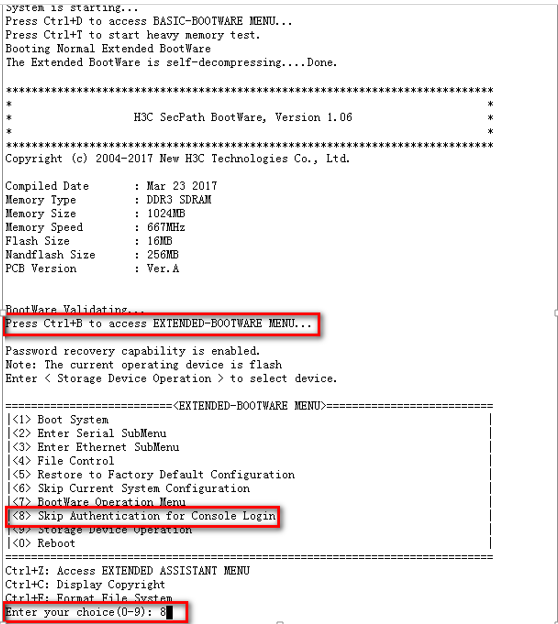 设备启动过程中根据提示按 crtl+B进入 bootware界面,选择 <8>跳过 Console 密码认证