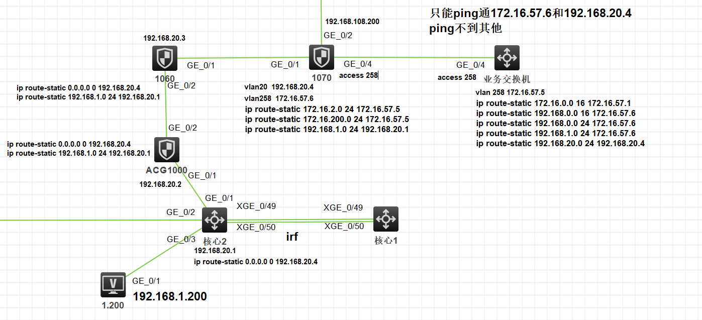 用模拟器做了如下图的设备,想用终端机ping到业务交换机,写了回程路由后发现一些问题,业务交换机可以ping通172.16.57.6和192.168.20.4,但ping不到192.168.20.1和192.168.1.1;终端机可以ping172.16.57.6和192.168.20.4,但ping不到172.16.57.5,1070防火墙可以ping通终端机和业务交换机,所有防火墙策略都是打通的了,是回程路由写得有点问题吗?