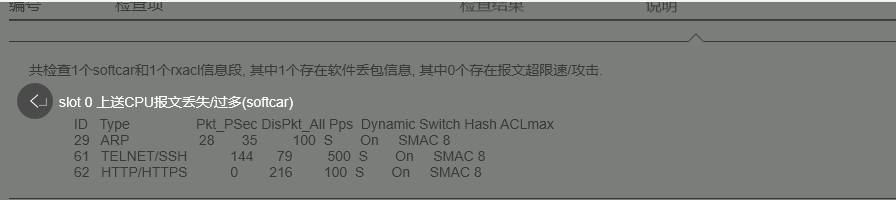 核心上有设备的网关下联二层交换机,近期发现有个别终端出现严重丢包 ,刚开始插拔网线就可以回复正常 ,之后过几天其他的个别设备也出现类似情况,出现情况的设备没有规律,收集了诊断信息发现了CPU报文丢失过多和ipc控制消息可能存在丢失,下面有截图和诊断的文件 ,请教各位大神有什么思路和解决方案