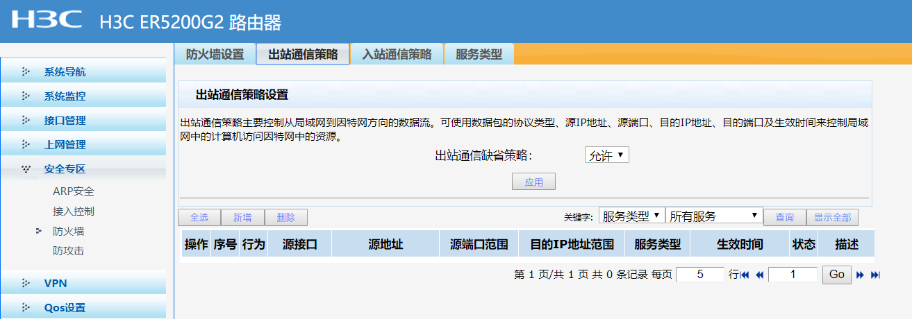 · 当路由器工作于NAT模式下时(即开启了NAT功能),入站通信缺省策略不允许配置,且仅为“禁止”;当路由器工作于路由模式下时(即关闭了NAT功能),入站通信缺省策略才允许选择配置,且缺省情况下为“允许”