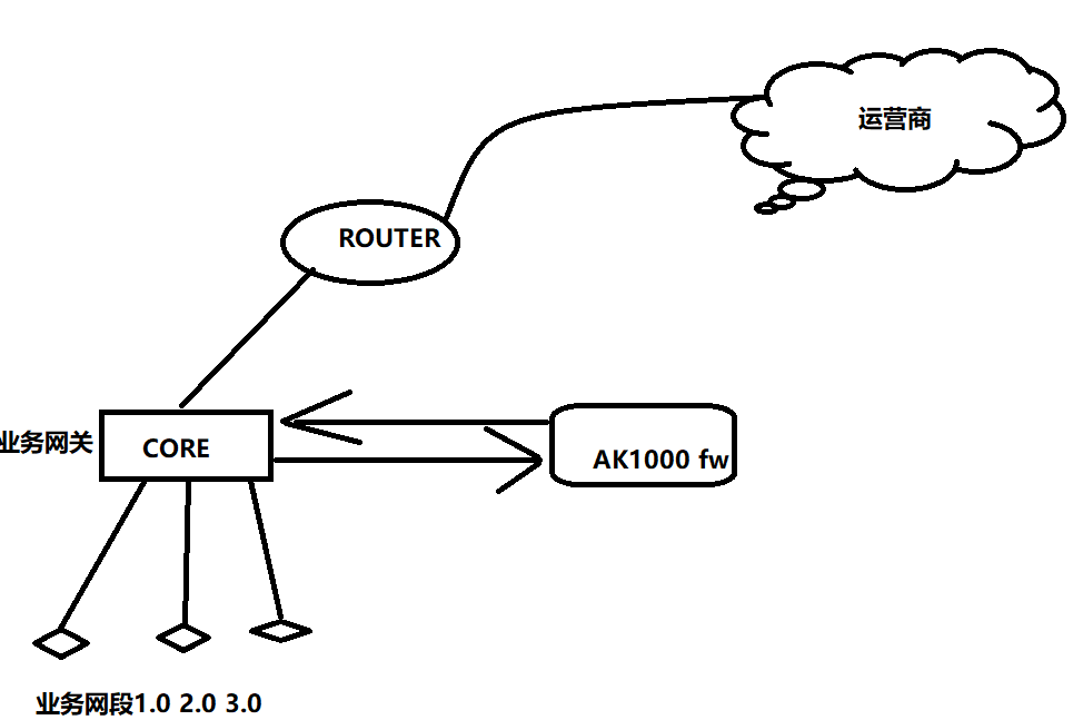 这样的话,需要将核心的流量引到防火墙上,防火墙处理完再送回核心;这样旁挂的话不如直接将fw放在核心和路由器中间,做个二层部署,这样组网不用变动,核心和路由器配置都不用动