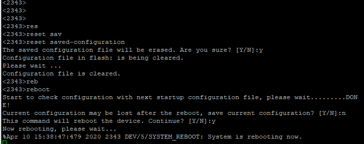 The saved configuration file will be erased. Are you sure? [Y/N]:y //设备提示保存的配置将会被删除,是否继续。