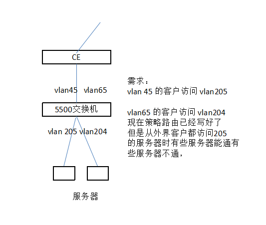 策略路由写一个单独写一个节点(node号小于去往204的策略的),里面写一条acl,acl源地址为vlan65的地址,目的地址为vlan205这边的地址,在刚写的那个策略路由节点里面,if-mactch 一下这个acl,然后不用写apply语句了,问题搞定