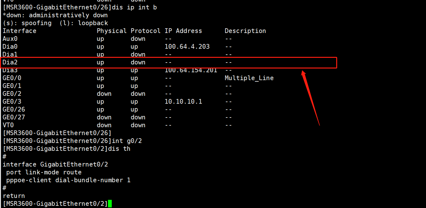 路由器是H3C MSR3600,在设置电信拨号上网的时候,无法获取到外网IP,通过dis ip int brief 查看到 protocol是down的状态