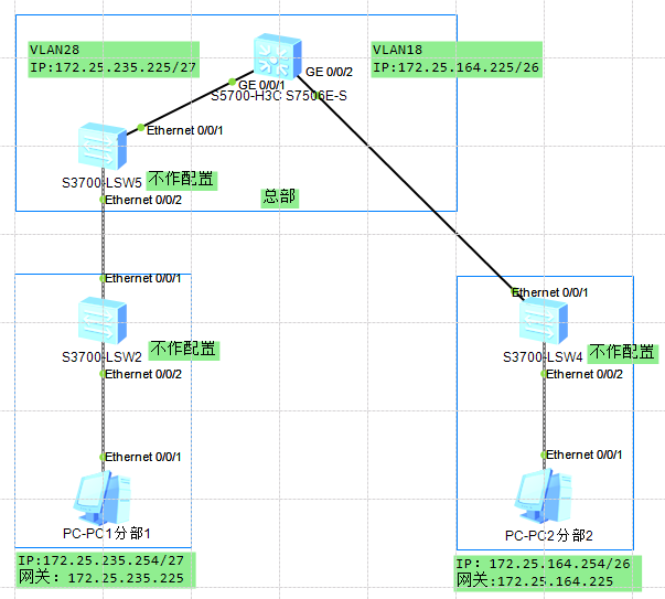理论上应该都是通的,实际情况是:在H3C S7506E-S中划2个VLAN作为网关下连接入交换机,SW5、SW2、SW4不作配置,总部7506E直连分部1交换机SW2是不通的,而总部7506E直连分部2交换机SW4是通的。总部7506E必须连接SW5后再连分部1交换机SW2才能通,这个问题要从哪着手排查呢?G0/0/1、G0/0/2都是port link-type access