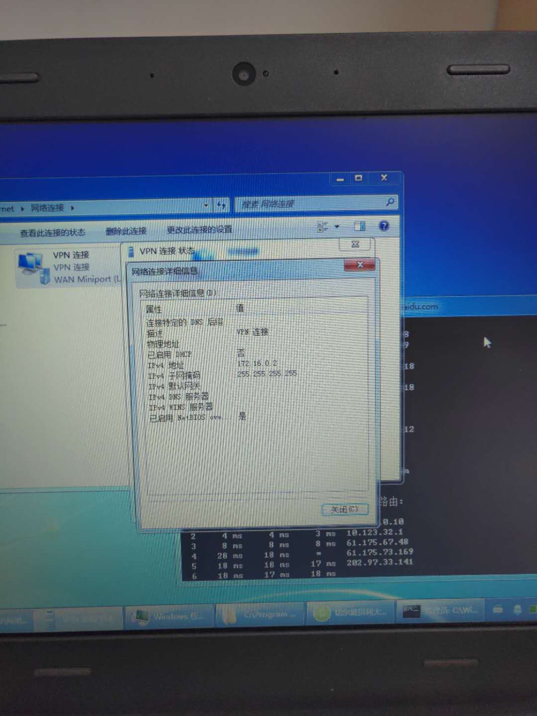 远端客户端,出口路由器思科1841 网关172.16.10.254 VPN能拨号上来,地址是10.16.0.2,能访问web不能上外网 ,求解释,不能上网时tracert时图如下: