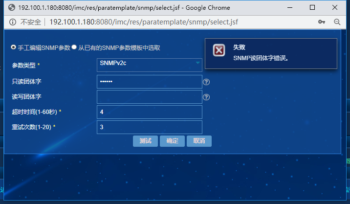 2、如果被纳管的设备不是华三的设备,建议先测试SNMP团体字先不要有特殊字符,测试通过后再配置有特殊字符的SNMP。