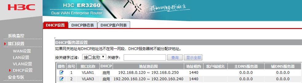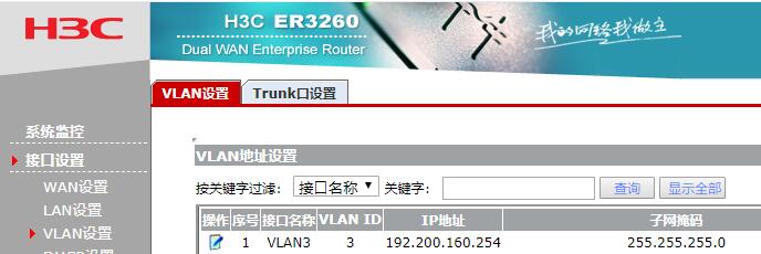 VLAN设置:序号:1 , 接口名称:VLAN3 ,vlan ID:3,IP地址192.200.160.254/24