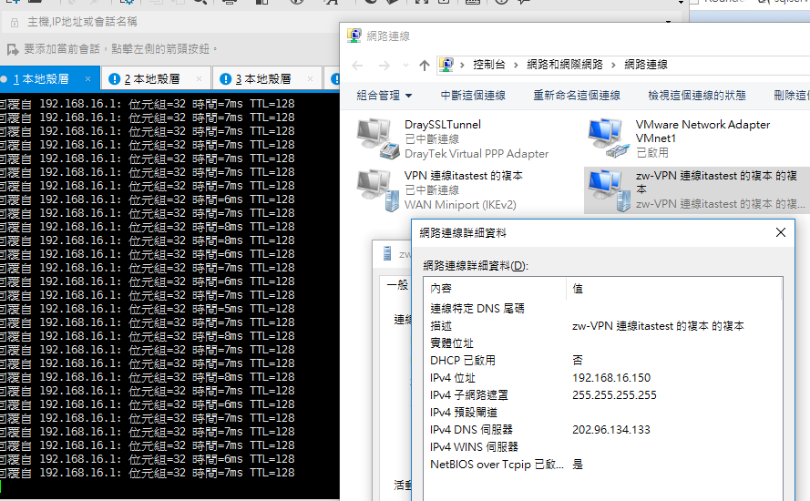 3.本地能连上VPN并获取到地址为192.168.16.150