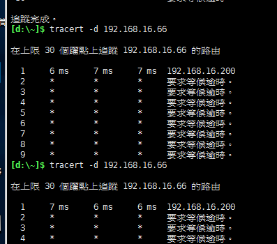 此时在192.168.16.150上路由跟踪到192.168.16.66,却只能到192.168.16.200(L2TP_VPN地址池的最后一个IP,就不下走了)