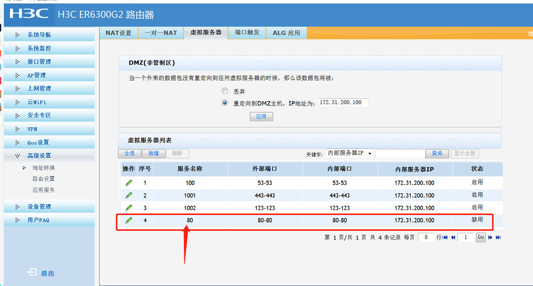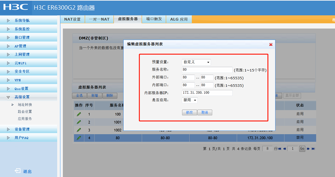 为了让我们的设备实现在线,设备需要上网的所有配置文件和设置都已弄好,然后想通过贵司的H3C ER6300G2路由器接入外网,但在修改和增加相应的路由器参数后,发现机组还是没能映射成功,按之前经验应该端口设置有问题,您这边对80的端口会有权限设置吗?或者您有什么好的建议?