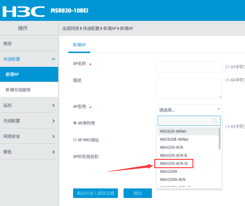 新购入一个ap,wa4320-ACN-SI,想把他加入AC管理,快速增加不行,请问怎么加入,并设置无线密码?