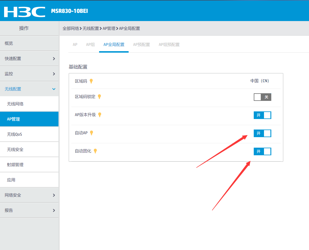 瘦ap 能获取到IP 打开无限配置 AP全局配置打开自动AP 自动固化就可以了