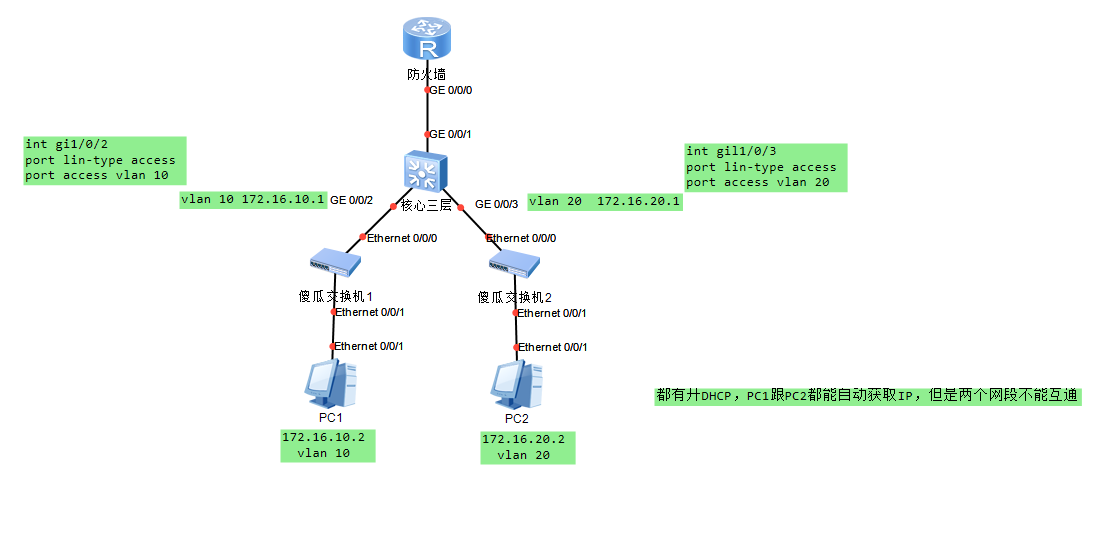 网络环境跟上图一样,端口用的ACCESS,客户端电脑能拿到对应的DHCP IP地址,但是VLAN 10 跟VLAN 20不能互通。 还有个特殊情况就是有试过把三层上面的2、3号端口模式改成trunk,改了后,下面两台PC拿到的IP都是默认VLAN1的IP 。是不是没有配静态路由去原因呀,三层的上层设备是防火墙接的是三层的23号端口。请大神指点,看看是哪里漏掉什么了。