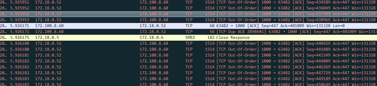 怀疑有病毒攻击。查看tcp报文,有大量的,out of order。请问各位大拿有没有其他思路