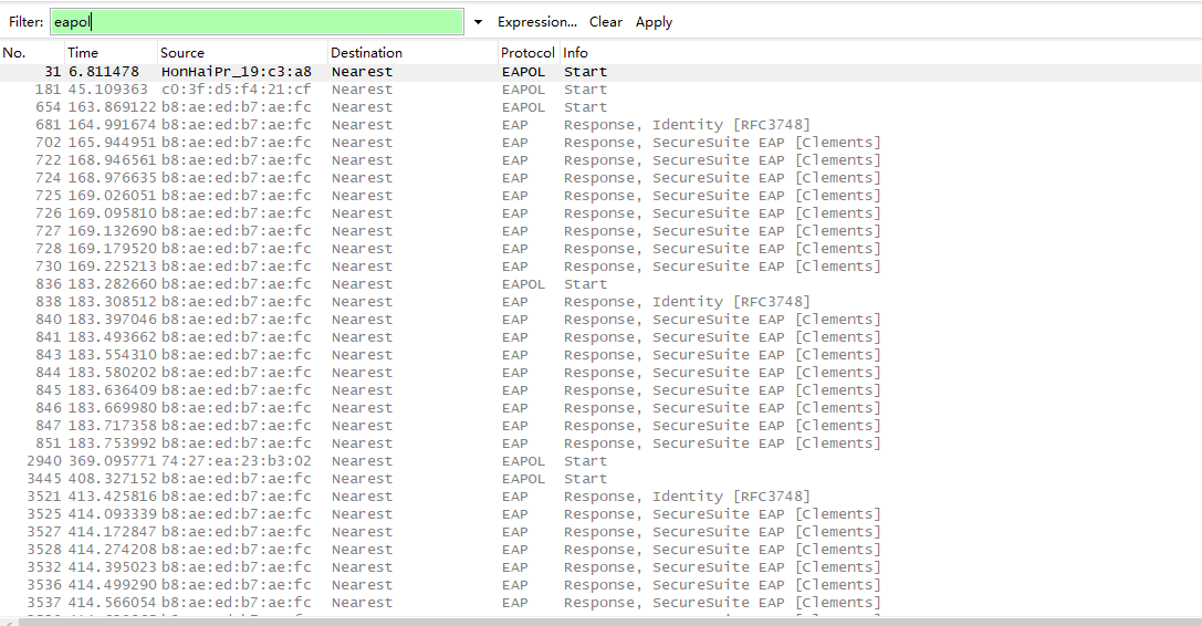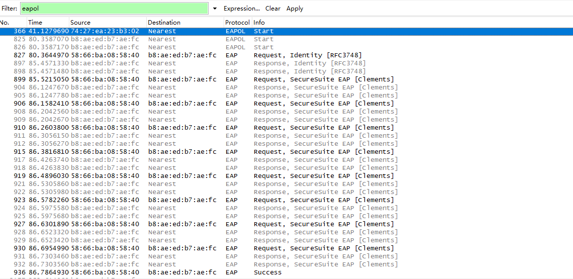 做802.1X认证,用天融信准入软件,图一,在PC本地开wireshark能看到完整认证过程,图二在交换机抓取镜像包,看不到交换机回复的request,是不是这款交换机镜像包有bug.抓取的镜像是both的,感觉只有单方向报文。