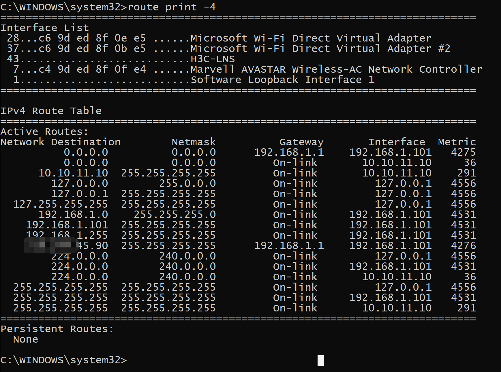 取消 在远程网络上使用默认网关 后,连接vpn的路由表: