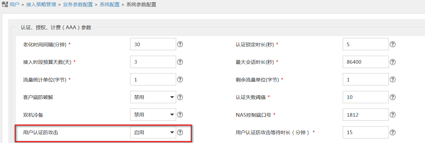 认证失败阈值:用户使用某服务进行身份认证时,如果一段时间内连续认证密码错误次数达到该值时,该用户将被暂时加入黑名单。加入黑名单后,该用户不能再使用相同MAC地址的计算机上线,直到次日零时以后才能重新认证。如果设置值为0,则不检查密码错误次数。