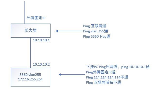 确认下5560是否有去外网的路由,且上行设备是否有5560的回程路由。