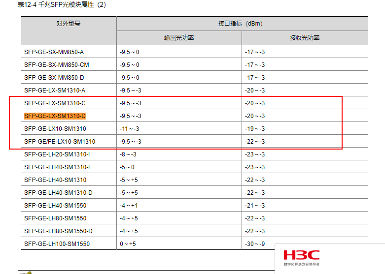 求H3C SFP-GE-LX-SM1310-D光模块的相关参数,特别是光衰值的要求