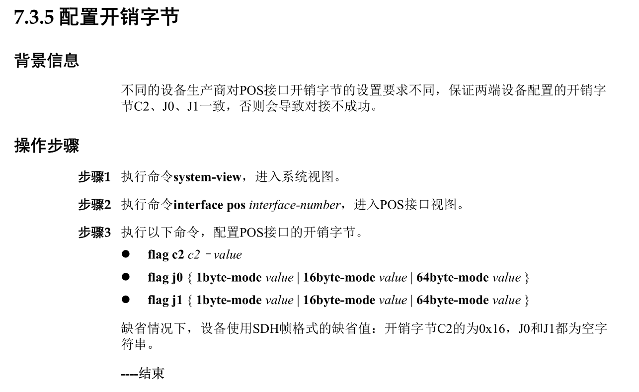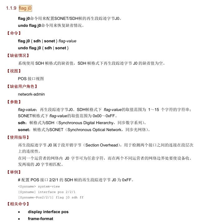 要对华为的路由器做割接到MSR5660,两台设备都安装了带有pos接口的板卡,再查看华为pos接口命令时发现一条命令 flag j0 16byte-mod cc ,这条命令无法在MSR5660中设别,后来查了一遍pos接口设备设置命令,查到MSR的pos接口的命令是