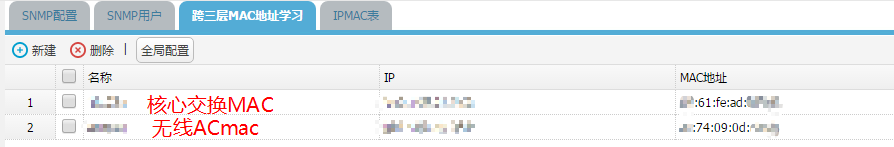 然后笔记本用户B网段依旧显示核心交换的mac地址,尝试添加无线ac的mac,IPMAC表能看到用户mac