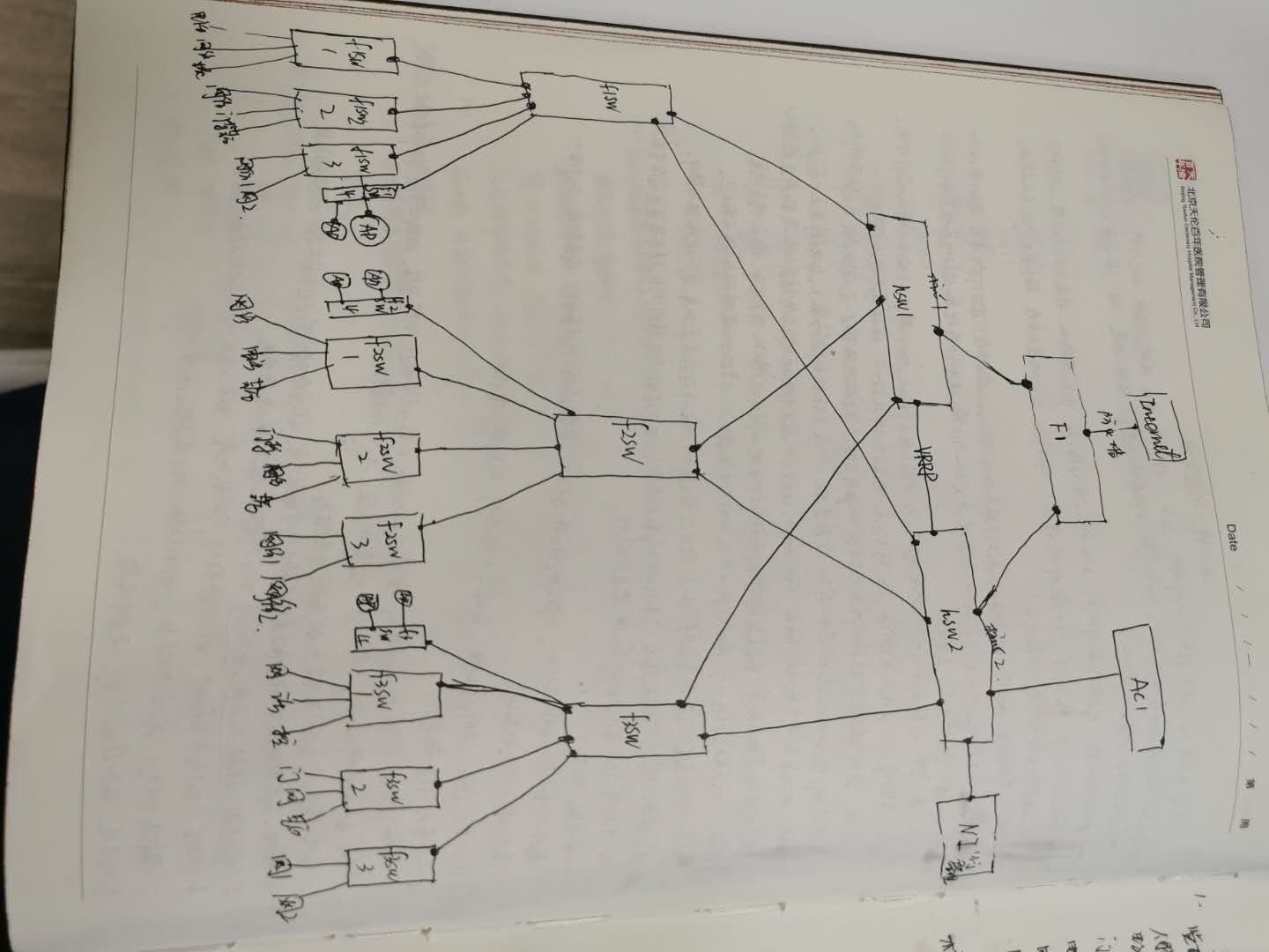 2、如图:各层机房交换机,设备为:H3C S5120V2-52P跟28P两种,接AC和人像,监控的为S5120POE供电交换机。而且,同一个交换机上,可能有门禁,网络,广告等几种网络,也可能为网络一种。核心交换机为:H3CS6520X-16ST-SI,计划两台同型号设备做双核心。防火墙为H3C  SecPath F1000-C-G。行为管理器为:网康NI-3200-45。AC,AP为不知名产品。
