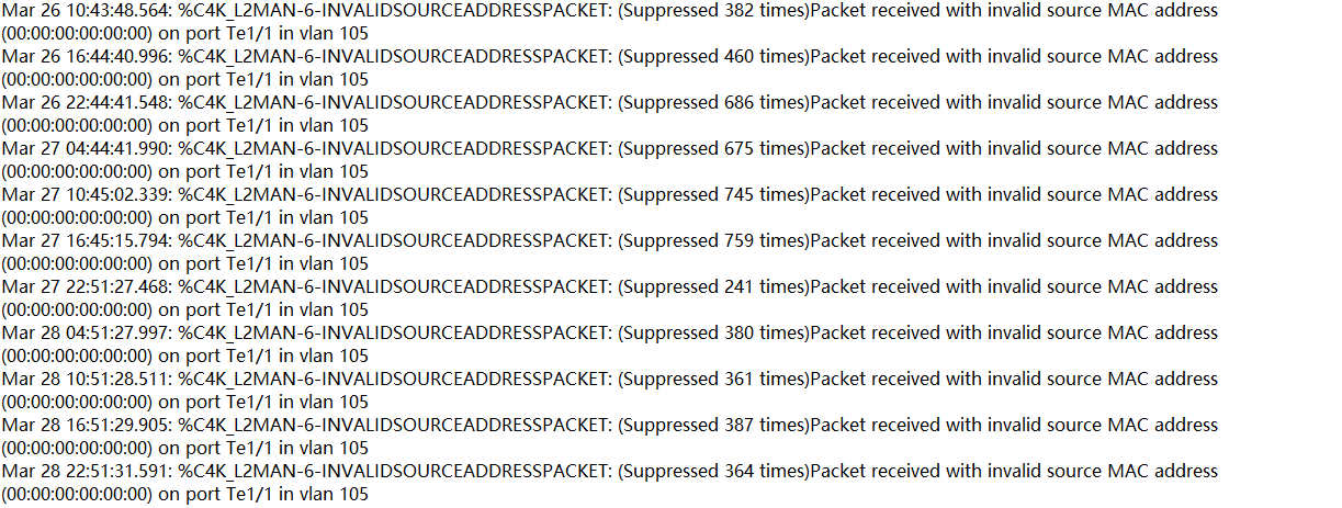 应该是收到源mac是全0的报文,认为是非法报文。建议看一下这个端口连的是什么设备。