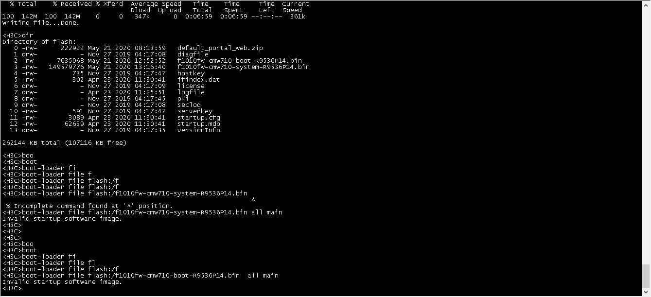 一台f1000-ak115出厂自带版本是f1010fw-cmw710-system-r9524p22.bin,现在要升级到f1010fw-cmw710-system-R9536P14.bin。