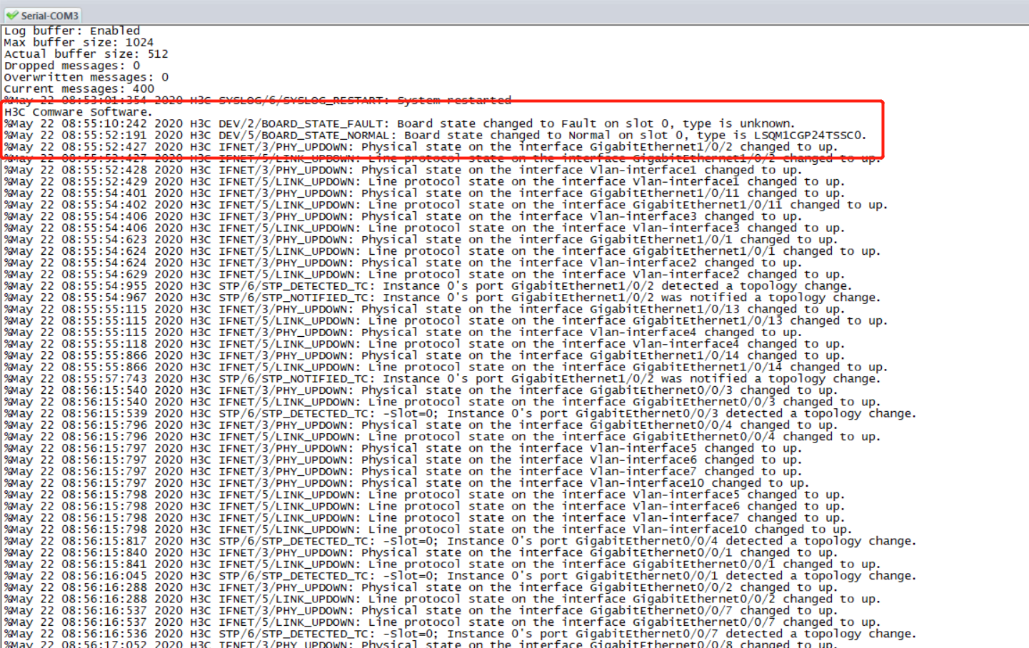 红框圈出部分为1槽上故障的接口,个别接口指示灯常亮,经测试,17-24口都用不了,(接口视图没有shutdown)