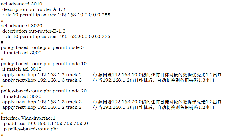 apply next-hop 192.168.1.3 track 3 //源网段192.168.20.0访问任何目标网段的数据优先走1.3出口