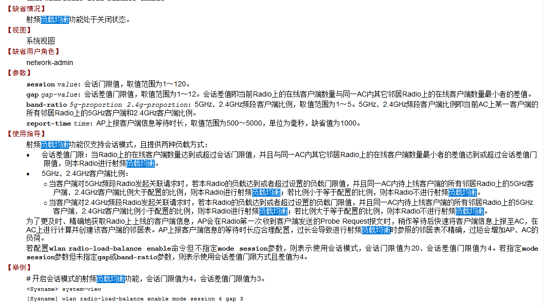 gap gap-value:会话差值门限值,取值范围为1~12。会话差值即当前Radio上的在线客户端数量与同一AC内其它邻居Radio上的在线客户端数量最小者的差值。