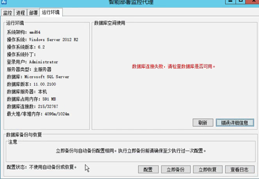 com.microsoft.sqlserver.jdbc.SQLServerException: 无法打开登录所请求的数据库 "perf_db"。登录失败。 ClientConnectionId:93c83405-c8dc-4004-adeb-c3a03015d0fc at com.microsoft.sqlserver.jdbc.SQLServerException.makeFromDatabaseError(SQLServerException.java:216) at com.microsoft.sqlserver.jdbc.TDSTokenHandler.onEOF(tdsparser.java:254) at com.microsoft.sqlserver.jdbc.TDSParser.parse(tdsparser.java:84) at com.microsoft.sqlserver.jdbc.SQLServerConnection.sendLogon(SQLServerConnection.java:2908) at com.microsoft.sqlserver.jdbc.SQLServerConnection.logon(SQLServerConnection.java:2234) at com.microsoft.sqlserver.jdbc.SQLServerConnection.access$000(SQLServerConnection.java:41) at com.microsoft.sqlserver.jdbc.SQLServerConnection$LogonCommand.doExecute(SQLServerConnection.java:2220) at com.microsoft.sqlserver.jdbc.TDSCommand.execute(IOBuffer.java:5696) at com.microsoft.sqlserver.jdbc.SQLServerConnection.executeCommand(SQLServerConnection.java:1715) at com.microsoft.sqlserver.jdbc.SQLServerConnection.connectHelper(SQLServerConnection.java:1326) at com.microsoft.sqlserver.jdbc.SQLServerConnection.login(SQLServerConnection.java:991) at com.microsoft.sqlserver.jdbc.SQLServerConnection.connect(SQLServerConnection.java:827) at com.microsoft.sqlserver.jdbc.SQLServerDriver.connect(SQLServerDriver.java:1012) at java.sql.DriverManager.getConnection(DriverManager.java:582) at java.sql.DriverManager.getConnection(DriverManager.java:154) at com.h3c.imc.deploy.dma.EnvPanel.a(EnvPanel.java:1096) at com.h3c.imc.deploy.dma.EnvPanel.E(EnvPanel.java:1049) at com.h3c.imc.deploy.dma.EnvPanel.a(EnvPanel.java:128) at com.h3c.imc.deploy.dma.az.run(EnvPanel.java:625)