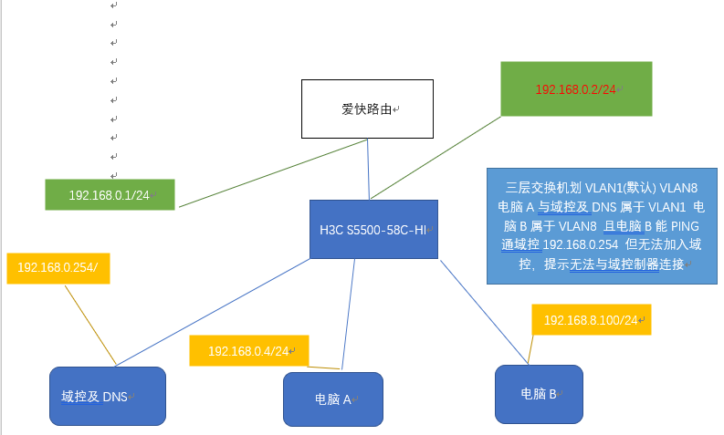 唉,头痛,哈哈 VLAN8的电脑上网什么的都正常,就是连域控连不了,