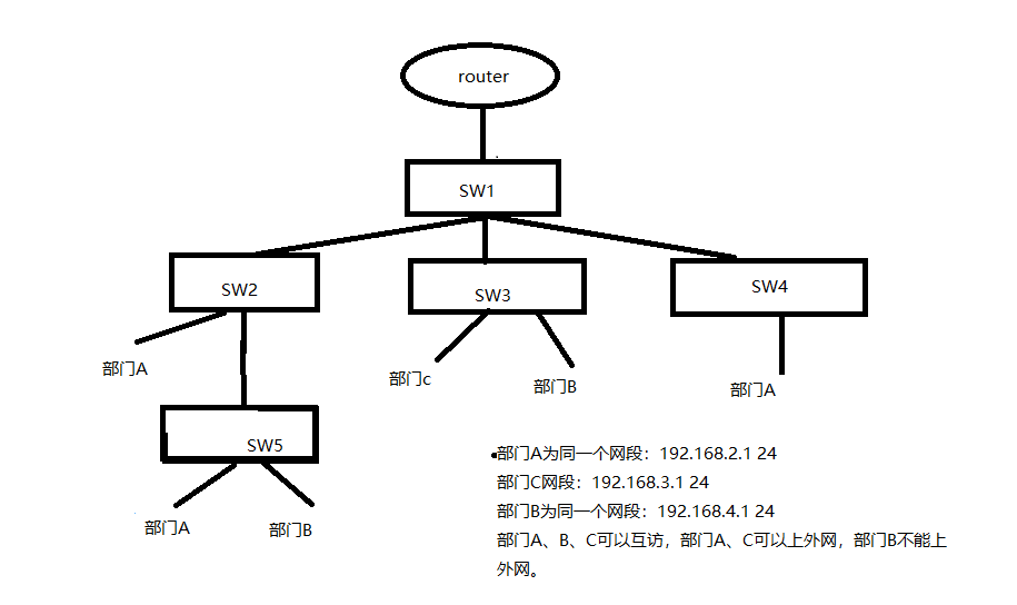 2、SW2、SW3、SW4、SW5可以作为二层交换机,同时与SW1使用trunk互联。