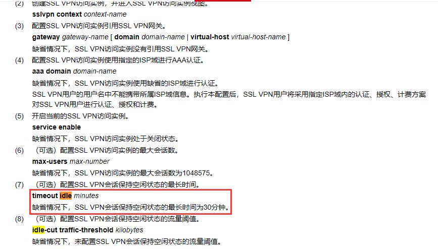 空闲超时时间与空闲流量阈值一起使用,当两者同时配置时,如果在空闲超时时间内,若SSLVPN用户发送到SLLVPN网关的流量未超过空闲流量阈值,则SSLVPN网关会断开会话,用户会被强制下线。