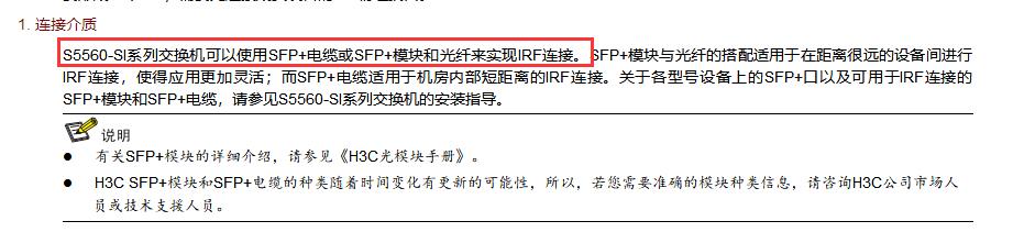 表1-1 S5560-EI系列交换机可用的IRF物理端口 设备型号 可用的IRF物理端口 · S5560-30S-EI · S5560-54S-EI · 前面板上的SFP+口 · 后面板上的QSFP+口 · S5560-30F-EI · S5560-30C-EI · S5560-30C-PWR-EI · S5560-34C-EI · S5560-54C-EI · S5560-54C-PWR-EI · 前面板上的SFP+口 · 后面板上通过插入接口模块扩展卡获得的10GE以太网口/SFP+口/QSFP+口 S5560-54QS-EI 前面板上的SFP+口和QSFP+口