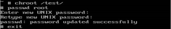步骤4 使用chroot命令更改程序执行时所参考的根目录位置,把根目录切换到磁盘上,然后使用passwd命令修改根用户的密码,修改完之后退出。