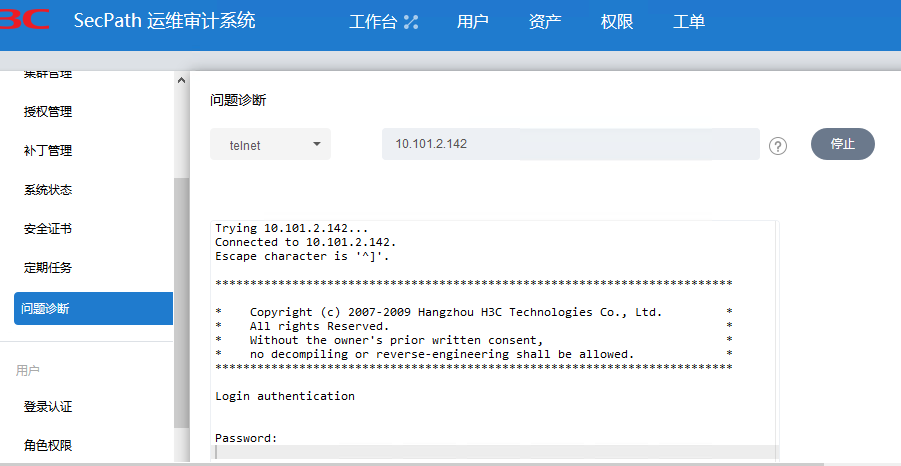 该资源在堡垒机中可以telnet,但登录堡垒机访问该资源一直登录不了,如下,不知是什么原因?