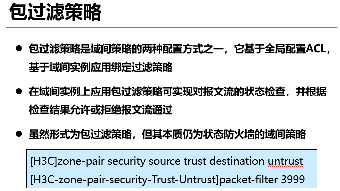 包过滤的核心是ACL(访问控制策略),可在接口、域间策略等视图下应用。