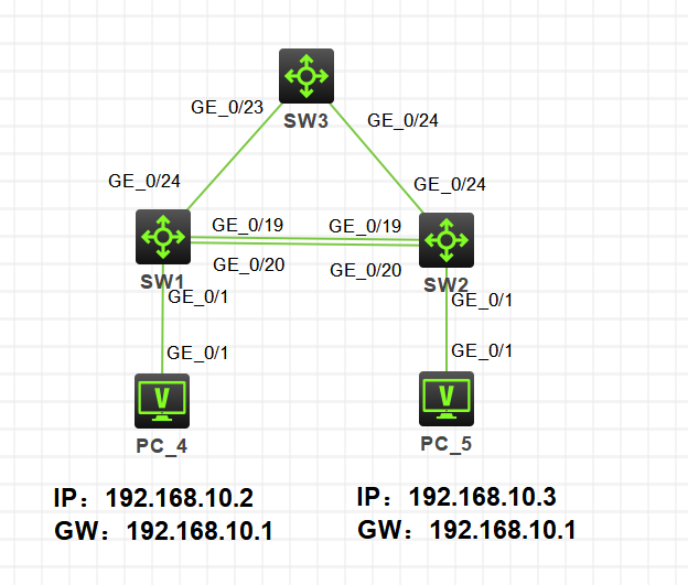 重点的是sw2交换机收到从sw3发来的帧,此时sw2的Mac地址表是空的,收到该帧后,将该帧的Mac地址与24口绑定起来,并将该帧泛洪出去。假设sw2先从19口将该帧发出去,sw1收到该帧后会更新自己的Mac地址表,将这个帧Mac与19口关联起来。之后一直重复这个过程,导致Mac地址表不断更新,这就是Mac地址震荡,并严重影响交换机性能。